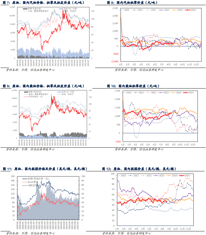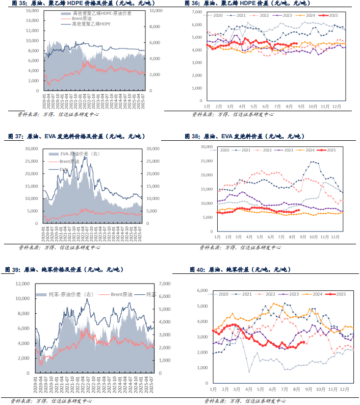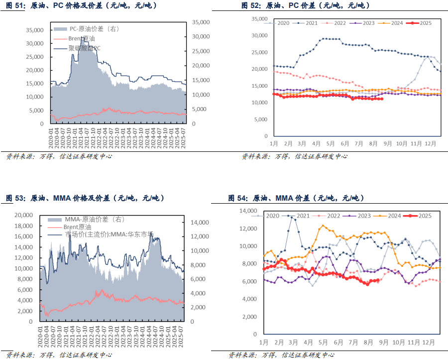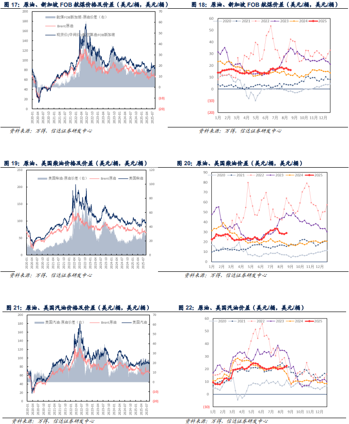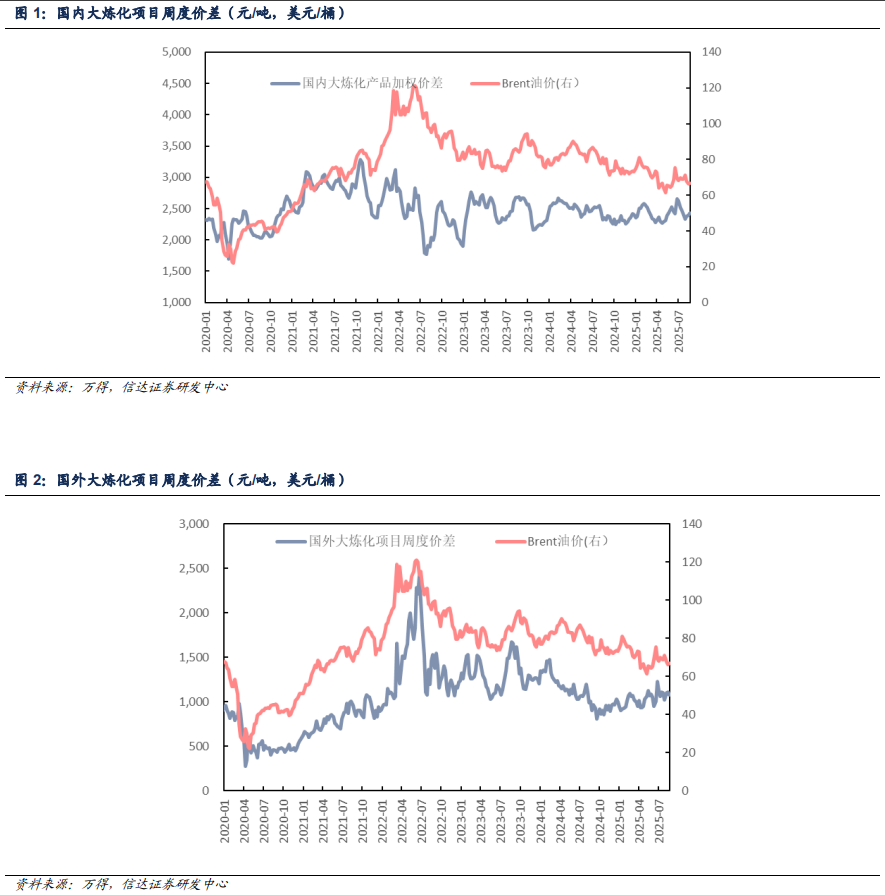 自2020年1月4日至2025年8月22日,布伦特周均原油价格涨幅为-0.97%,我们根据设计方案,以即期市场价格对国内和国外重点大炼化项目做价差跟踪,国内重点大炼化项目周均价差涨跌幅为+4.85%,国外重点大炼化项目周均价差涨跌幅为+14.80%。