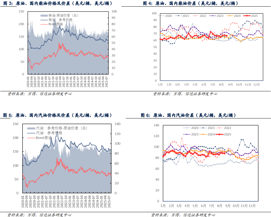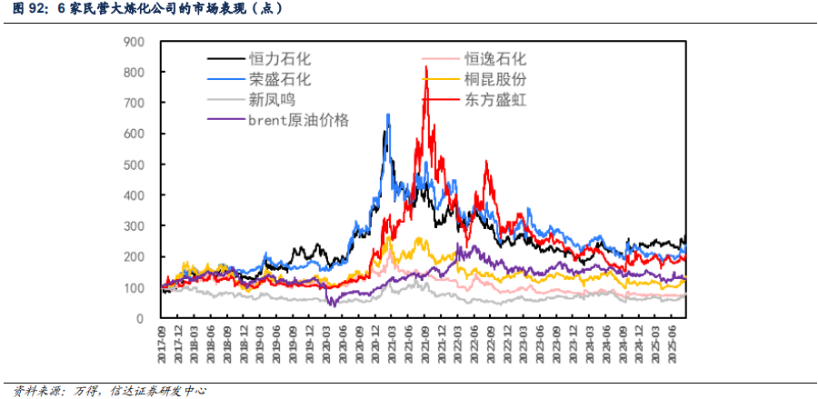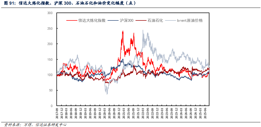 自2017年9月4日至2025年8月22日,信达大炼化指数涨幅为+39.08%,石油石化行业指数涨幅为+22.48%,沪深300指数涨幅为+13.84%,brent原油价格涨幅为+29.40%。我们以首篇大炼化行业报告《与国起航,石化供给侧结构性改革下的大道红利》的发布日(2017年9月4日)为基期,以100为基点,以恒力石化、恒逸石化、荣盛石化、桐昆股份、新凤鸣和东方盛虹6家民营炼化公司作为成份股,将其股价算数平均后作为指数编制依据。