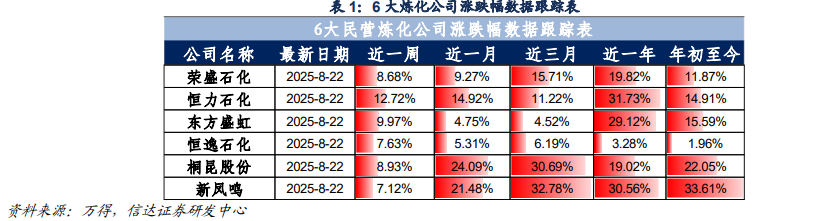 截止2025年8月22日,6家民营大炼化公司近一周股价涨跌幅为荣盛石化(+8.68%)、恒力石化(+12.72%)、东方盛虹(+9.97%)、恒逸石化(+7.63%)、桐昆股份(+8.93%)、新凤鸣(+7.12%)。