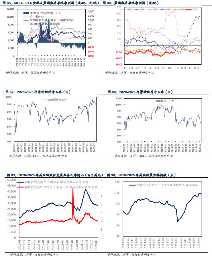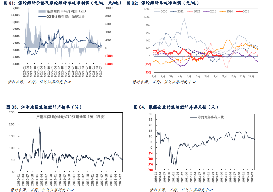 涤纶短纤:价格小幅回升。目前涤纶短纤周均价格6516.43(+34.29)元/吨,行业平均单吨盈利为19.55(+0.72)元/吨,涤纶短纤企业库存天数为6.65(-0.60)天,开工率91.90%(+0.80pct)。