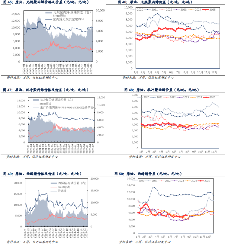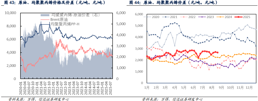 聚丙烯:本周原油价格震荡小涨,成本端带来一定支撑,但需求端相对偏弱,价格偏稳运行,价差整体收窄。本周均聚聚丙烯、无规聚丙烯、抗冲聚丙烯均价分别为6147.30(-15.22)、10000.00(0.00)、7300.00(+50.00)元/吨,与原油价差分别为2667.21(-38.66)、6519.91(-23.44)、3819.91(+26.56)元/吨。