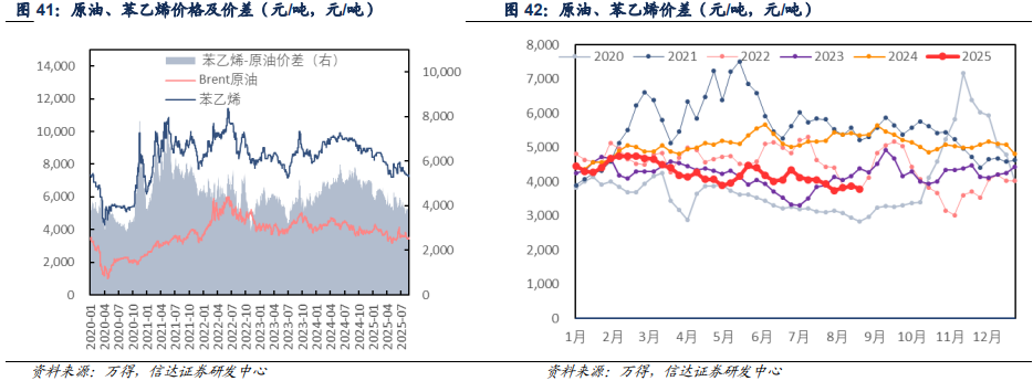 苯乙烯:产品价格小幅下跌,价差小幅走阔。本周苯乙烯均价7335.71(-14.29)元/吨,苯乙烯-原油价差3879.07(+56.41)元/吨。