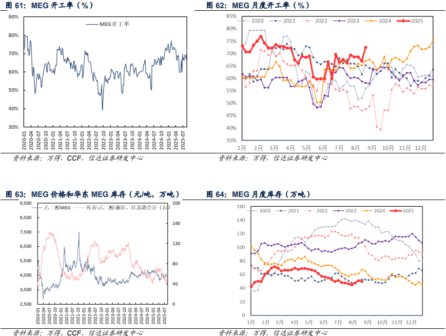 MEG:价格小幅下跌。目前MEG现货周均价格在4473.57(-7.14)元/吨,华东罐区库存为49.78(-3.67)万吨,开工率72.41%(+5.41pct)。