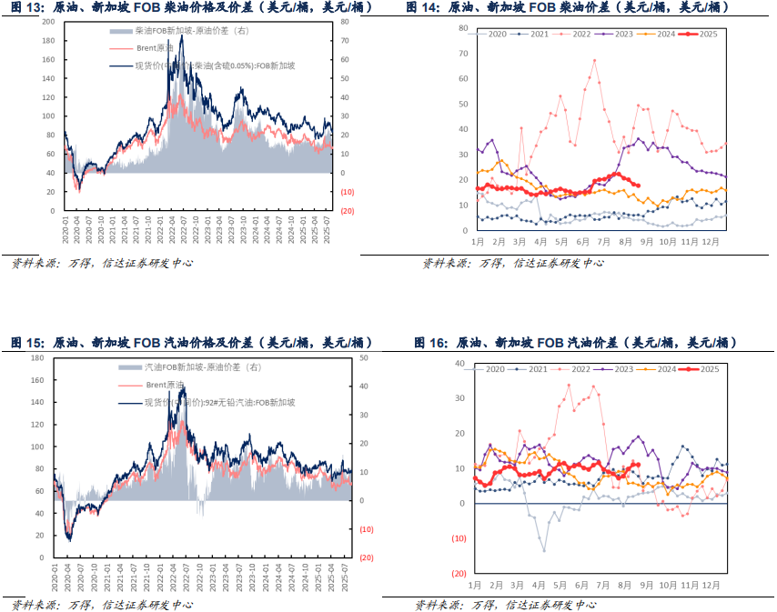 东南亚市场:本周新加坡柴油、汽油、航煤周均价分别为4388.07(-54.52)、4041.89(+4.28)、4310.64(-25.80)元/吨,折合84.28(-0.98)、77.63(+0.15)、82.79(-0.43)美元/桶,与原油价差分别为907.98(-77.96)、561.80(-19.16)、830.55(-49.24)元/吨,折合17.45(-1.47)、10.80(-0.35)、15.96(-0.92)美元/桶。
