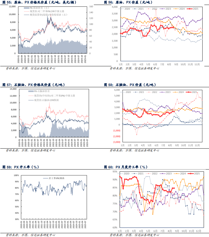 PX:本周原油价格震荡小涨,成本端支撑走强,产品价格有所回升,价差偏稳运行。目前PXCFR中国主港周均价在5975.48(+40.69)元/吨,PX与原油价差在2490.90(+12.77)元/吨,PX与石脑油周均价差在2251.56(-46.66)元/吨,开工率84.63%(0.00pct)。