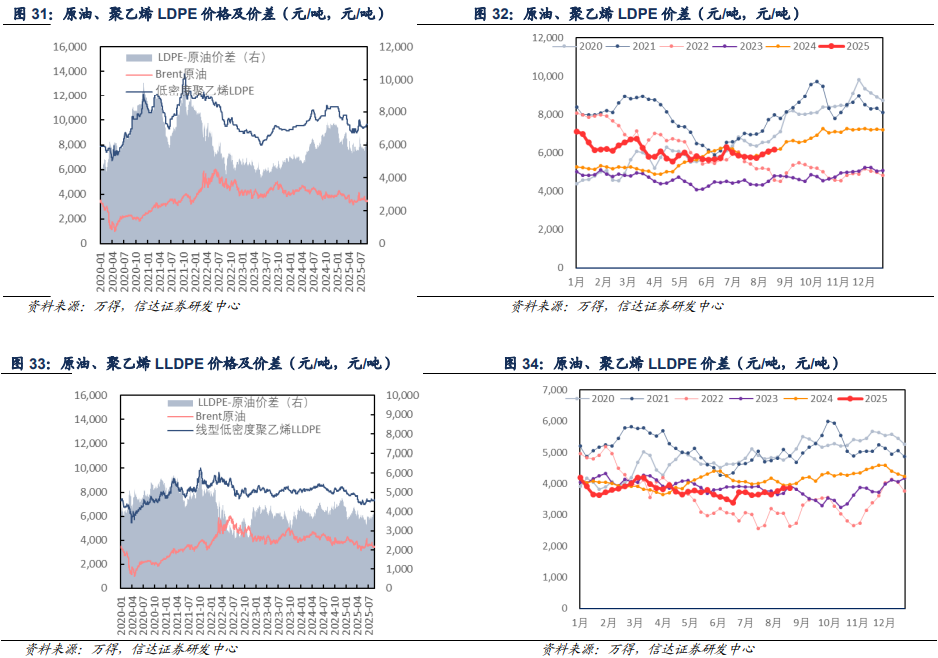 聚乙烯:本周原油价格震荡小涨,成本端支撑走强,叠加宏观面利好,产品价格有所上涨,价差整体走阔。本周LDPE、LLDPE、HDPE均价分别为9650.00(+114.29)、7342.29(+28.29)、8000.00(0.00)元/吨,与原油价差分别为6169.91(+90.85)、3862.20(+4.85)、4519.91(-23.44)元/吨。