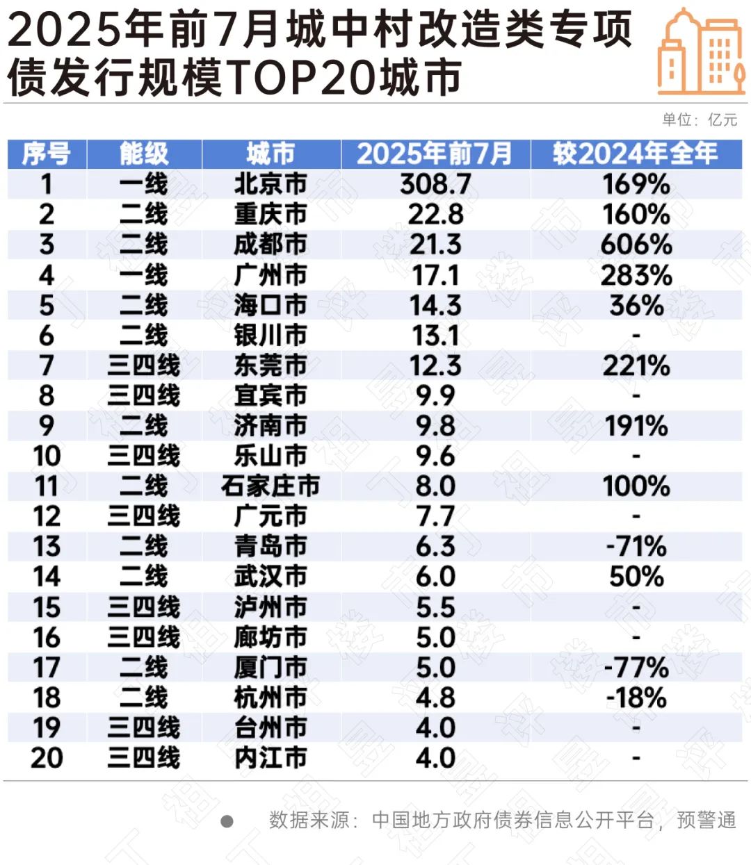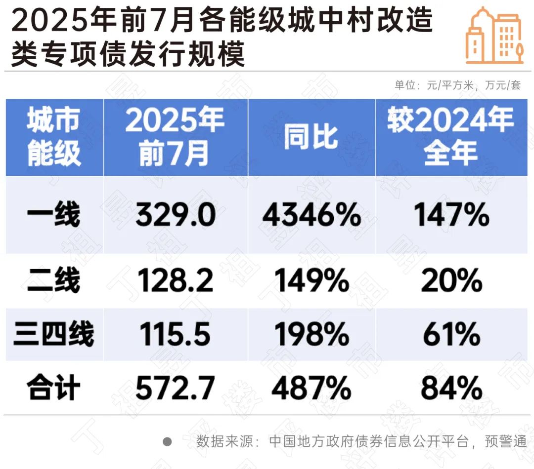 三线城市增速其次,同比增长198%,较2024年全年增长61%。作为城市高质量发展的重点区域,三线城市整体城镇化发展水平低于一二线,再加之主城区面积相对较小,在中心城区周边,仍有不少合适的城中村改造项目有待开发。2025年前7月三线城市共有156个城中村项目获得了专项债融资,相关项目数量达到了2025年同期的三倍。