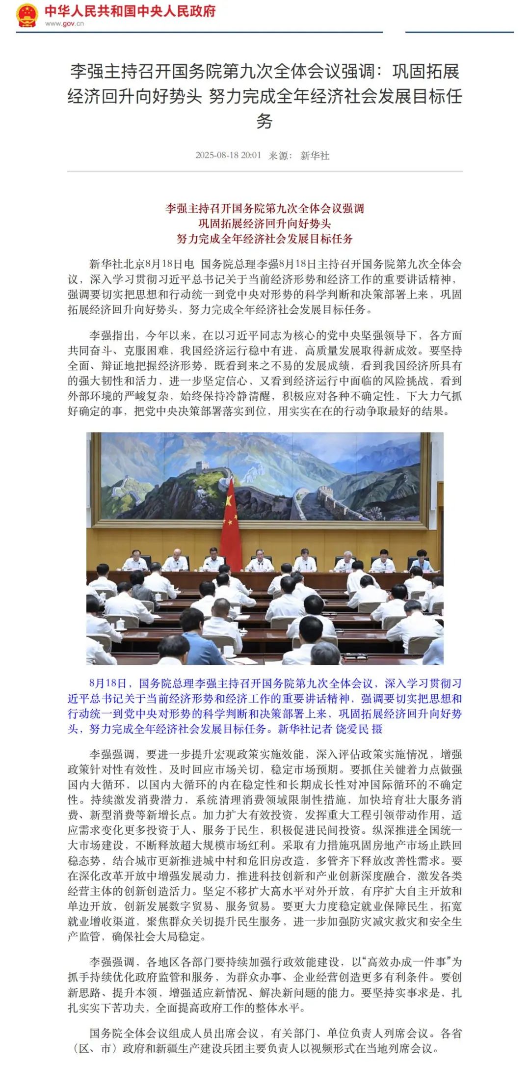 2025年8月18日,李强主持召开国务院第九次全体会议强调:采取有力措施巩固房地产市场止跌回稳态势,结合城市更新推进城中村和危旧房改造,多管齐下释放改善性需求。