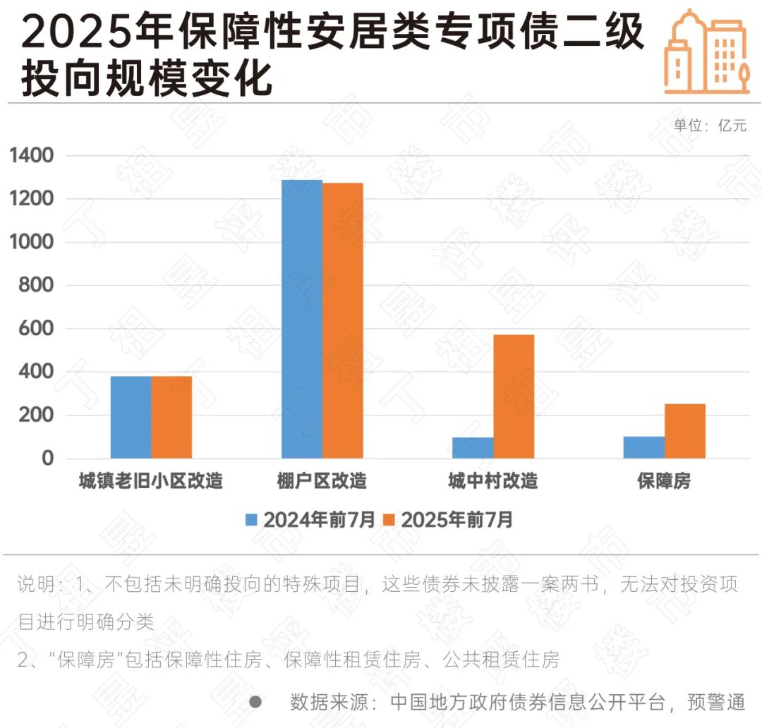 据克而瑞研究中心统计梳理,2025年前7月旧改、棚改类融资同比基本持平:旧改类专项债,共融资379亿元,与2024年同期相同;棚改类专项债同比微降1%,前7月分别融资1274亿元;